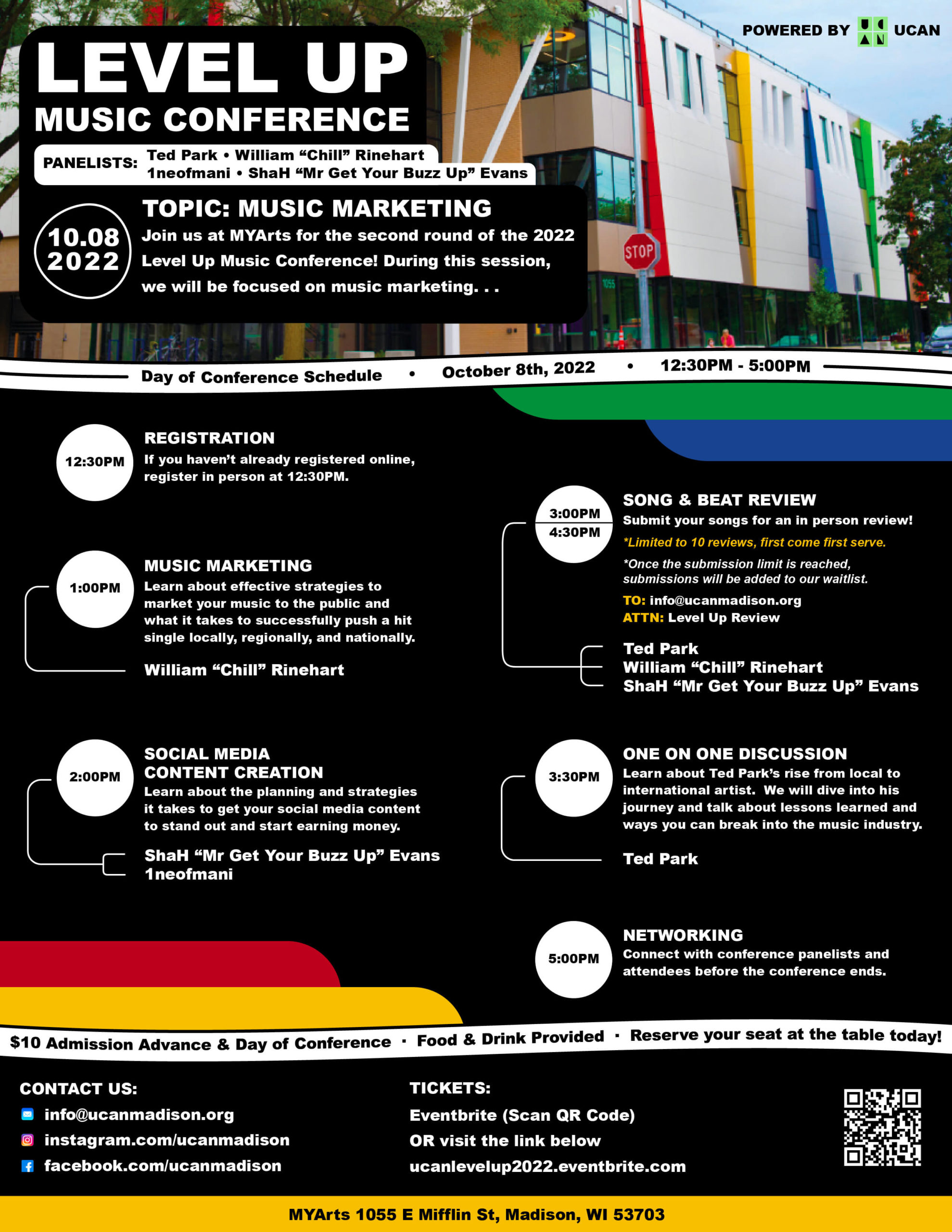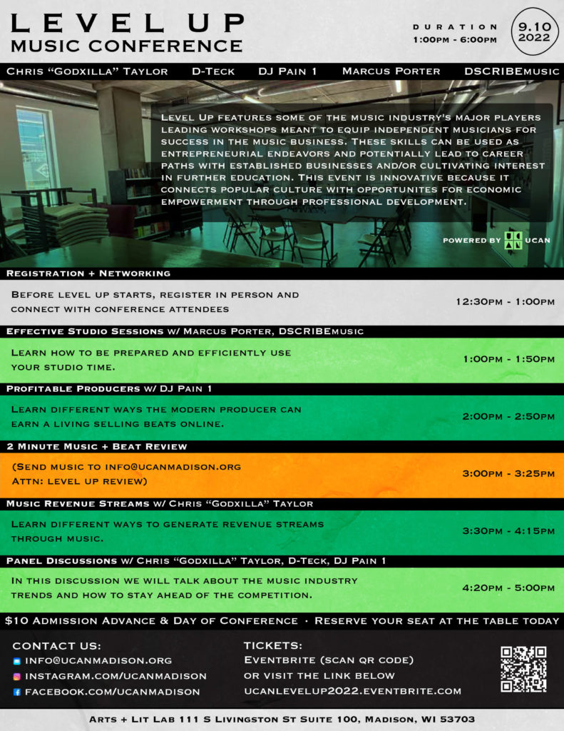 Click on an image to enlarge our previous 2022 Level Up Music Conference schedules. Sessions include presentations on studio efficiency, LLC creation, and more. Panelists include Chris “Godxilla” Taylor, D-Teck, DJ Pain 1, Marcus Porter, DSCRIBEmusic, Ted Park, William “Chill” Rinehart, 1neofmani, ShaH “Mr Get Your Buzz Up” Evans, Jasmine Mans, Bradley “DLO” Thomas, and Wendy Day.